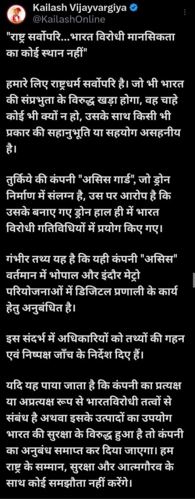 हेमंत शर्मा, इंदौर। तुर्किये की ड्रोन निर्माता कंपनी “असिस गार्ड” पर भारत विरोधी गतिविधियों में शामिल होने के गंभीर आरोपों के बीच, मध्य प्रदेश सरकार के कैबिनेट मंत्री कैलाश विजयवर्गीय ने कड़ा रुख अपनाया है। विजयवर्गीय ने अपने आधिकारिक सोशल मीडिया प्लेटफॉर्म X (पूर्व में ट्विटर) पर एक ट्वीट करते हुए कहा, “राष्ट्र सर्वोपरि…भारत विरोधी मानसिकता का कोई स्थान नहीं। हमारे लिए राष्ट्रधर्म सर्वोपरि है। जो भी भारत की संप्रभुता के विरुद्ध खड़ा होगा, वह चाहे कोई भी क्यों न हो, उसके साथ किसी भी प्रकार की सहानुभूति या सहयोग असहनीय है।”