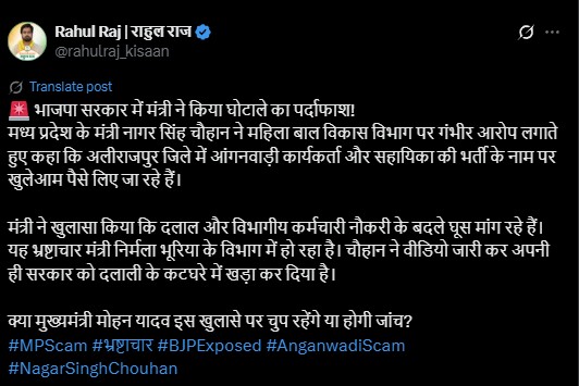 मंत्री के वीडियो के बाद कांग्रेस हमलावर हो गई है। मध्य प्रदेश प्रवक्ता राहुल राज ने अपने सोशल मीडिया पर मंत्री का वीडियो अपलोड कर लिखा, “मंत्री ने खोला घोटालों का पर्दाफाश। भाजपा सरकार में मंत्री ने खोला घोटाले का पर्दाफाश। मध्य प्रदेश के मंत्री नागर सिंह चौहान ने महिला बाल विकास विभाग पर गंभीर आरोप लगाते हुए कहा कि अलीराजपुर जिले में आंगनवाड़ी कार्यकर्ता और सहायिका की भर्ती के नाम पर खुलेआम पैसे लिए जा रहे हैं। मंत्री ने खुलासा किया कि दलाल और विभागीय कर्मचारी नौकरी के बदले घूस मांग रहे हैं। यह भ्रष्टाचार मंत्री निर्मला भूरिया के विभाग में हो रहा है। चौहान ने वीडियो जारी कर अपनी ही सरकार को दलाली के कटघरे में खड़ा कर दिया है। क्या मुख्यमंत्री मोहन यादव इस खुलासे पर चुप रहेंगे या होगी जांच?”