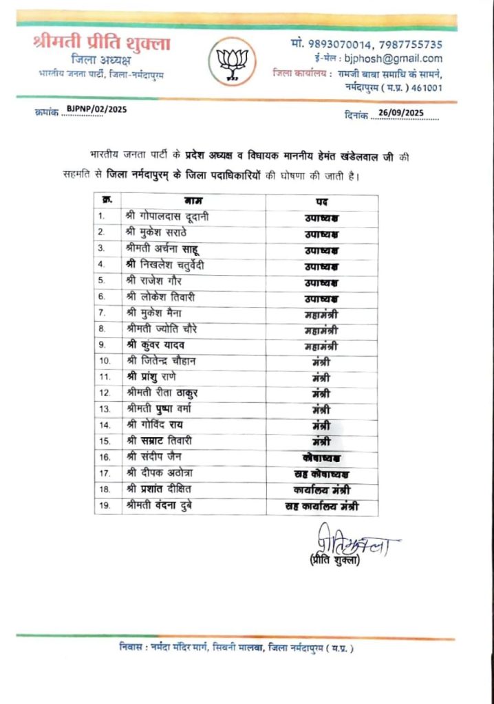 शब्बीर अहमद, भोपाल। मध्यप्रदेश में हेमंत खंडेलवाल के बीजेपी प्रदेश अध्यक्ष बनने के बाद जिलों कार्यकारिणी की घोषणा की जा रही है। इसी कड़ी में आज नर्मदापुरम जिला बीजेपी की कार्यकारिणी घोषित की गई है।