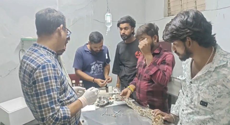 इंद्रपाल सिंह, नर्मदापुरम. मध्य प्रदेश के नर्मदापुरम में एक अनोखा मामला सामने आया है. जहां 7 फीट लंबे घायल अजगर की सफल सर्जरी की गई. यह सांप गंभीर रूप से घायल हो गया था और उसकी जान बचाने के लिए पशु चिकित्सकों ने सर्जरी करने का निर्णय लिया. सांप की सर्जरी के दौरान, डॉक्टर अरविंद गुप्ता ने सांप के घायल हिस्से पर लोकल एनेस्थीसिया देकर सुन्न कर दिया. जिसके बाद डॉक्टर अरविंद गुप्ता के नेतृत्व में तीन सदस्यीय पशु चिकित्सकों की टीम ने सांप की सर्जरी की. करीब आधे घंटे तक चली सांप सर्जरी में सांप को 21 टांके आए. इस तरह डॉक्टरों की टीम ने सांप का ऑपरेशन किया और उसकी जान बचाई.