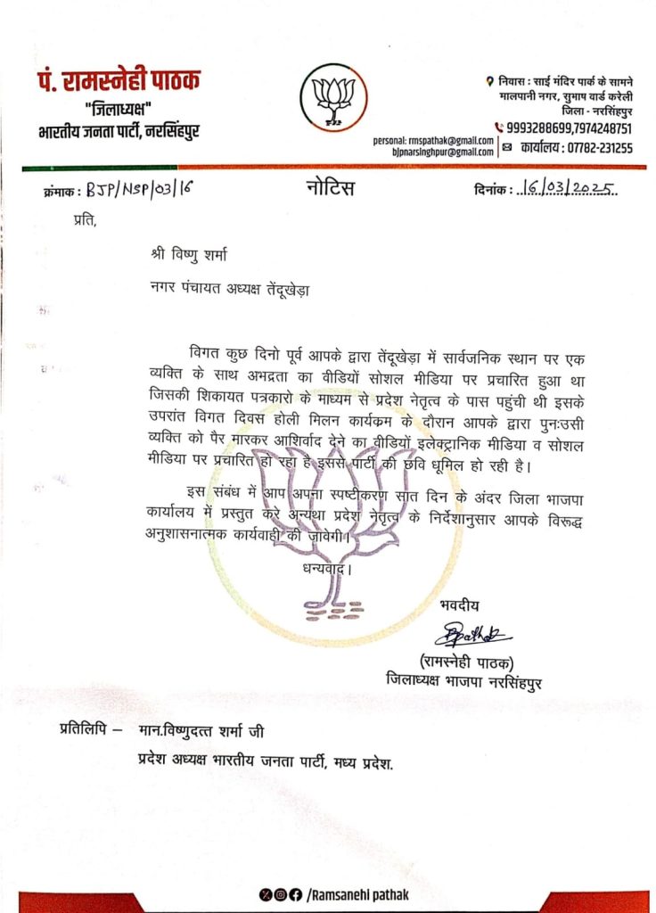 दीपक कौरव, नरसिंहपुर। मध्य प्रदेश में एक बार फिर लल्लूराम डॉट कॉम की खबर का बड़ा असर हुआ है। आशीर्वाद लेने आए लोगों को लात मारने वाले नगर पालिका अध्यक्ष विष्णु शर्मा को बीजेपी ने कारण बताओ नोटिस जारी किया है। बता दें कि बीजेपी नेता का लात मारने का वीडियो सोशल मीडिया पर वायरल हुआ था। लल्लूराम डॉट कॉम ने प्रमुखता से खबर को प्रकाशित किया था। जिसके बाद भाजपा ने इस मामले पर संज्ञान लेते हुए कार्रवाई की है।
