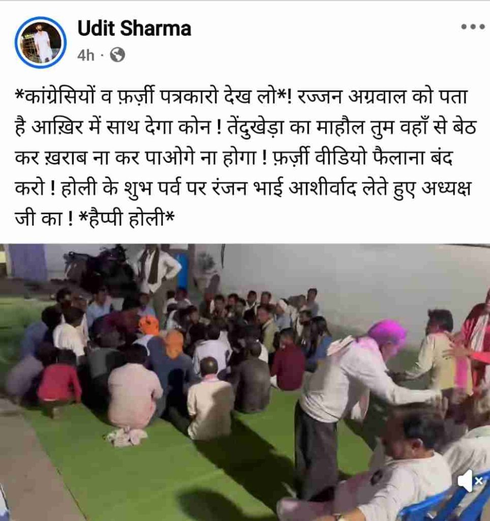 वीडियो वायरल होने के बाद भाजयुमो के मंडल अध्यक्ष उदित शर्मा ने उनके समर्थन में पोस्ट कर कांग्रेस और मीडिया पर निशाना साध दिया। उदित शर्मा ने लिखा, “कांग्रेसियों व फर्जी पत्रकारों देख लो। रंजन अग्रवाल को पता है आखिर में साथ कौन देगा? तेंदूखेड़ा का माहौल तुम वहां से बैठ कर खराब न कर पाओगे, ना होगा। फर्जी वीडियो फैलाना बंद करो। होली के शुभ पर्व पर रंजन भाई आशीर्वाद लेते हुए अध्यक्ष जी का….हैप्पी होली।”