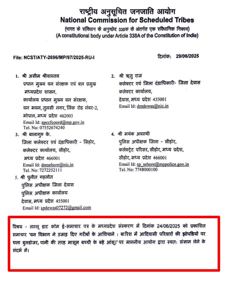 देवास/भोपाल। मध्य प्रदेश के देवास जिले में वन विभाग के द्वारा बीते दिनों आदिवासी परिवारों के आशियाने पर बुलडोजर कार्रवाई की गई थी। इस खबर को लल्लूराम डॉट कॉम ने दिनांक 24.06.2025 को ‘वन विभाग ने उजाड़ दिए गरीबों के आशियाने: बारिश में आदिवासी परिवारों की झोपड़ियों पर चला बुलडोजर, पानी की तरह मासूम बच्ची के बहे आंसू ‘ इस हेडलाइन से प्रमुखता से प्रकाशित किया था। वहीं लल्लूराम डॉट कॉम की इस खबर पर ‘राष्ट्रीय अनुसूचित जनजाति आयोग’ ने स्वतः संज्ञान लेते हुए वन विभाग, एसपी,कलेक्टर समेत प्रशासन के जिम्मेदार अधिकारियों को नोटिस जारी किया है। साथ ही इस मामले में कार्रवाई के निर्देश भी दिए हैं। NCST के राष्ट्रीय अध्यक्ष अन्तर सिंह आर्य भी अपने सभी दौरे रद्द कर मंगलवार 1 जुलाई को प्रभावितों से मुलाकात करने देवास पहुंचेंगे।