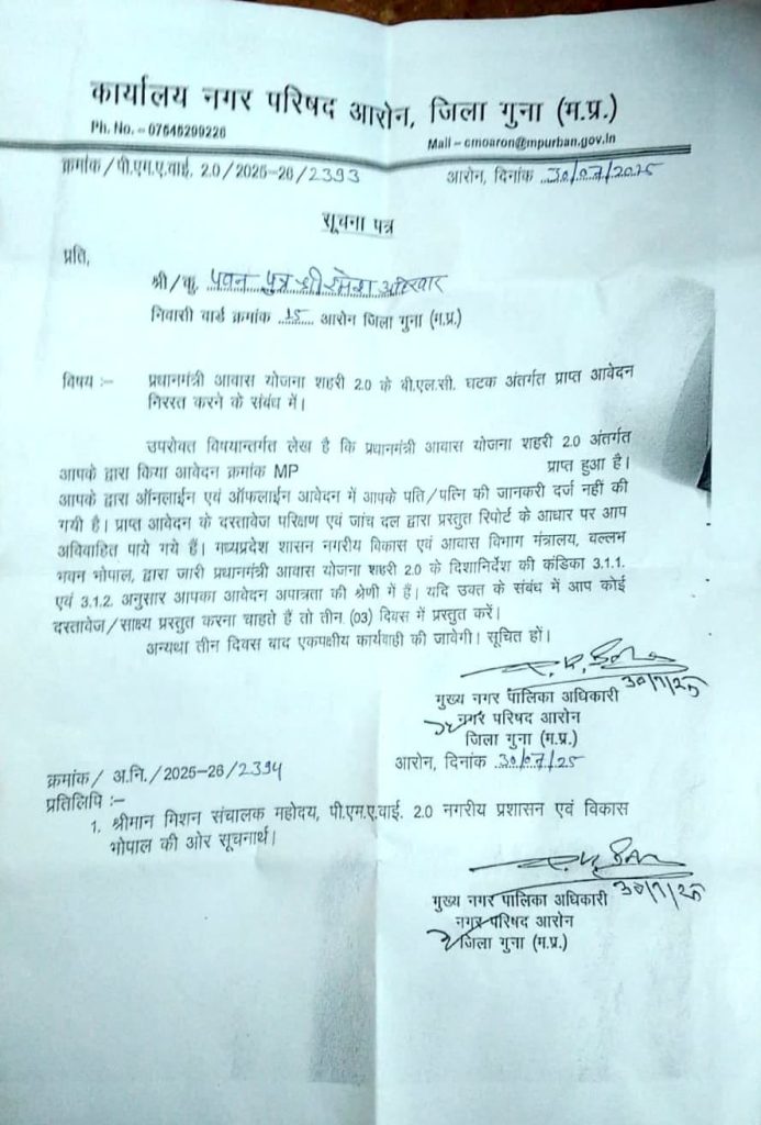 एसआर रघुवंशी, गुना। प्रधानमंत्री आवास योजना का लाभ लेने पहुंचे एक दिव्यांग युवक को सरकारी सिस्टम की अजीब शर्त ने परेशान कर दिया। गुना जिले के आरोन कस्बे के वार्ड क्रमांक-15 निवासी पवन अहिरवार, जो शारीरिक रूप से दिव्यांग हैं, ने योजना के तहत पक्का मकान पाने के लिए आवेदन किया था। लेकिन नगर परिषद आरोन की ओर से उन्हें ऐसा नोटिस थमा दिया गया, जिसमें कहा गया है कि अविवाहित होने के कारण वह योजना के पात्र नहीं हैं।