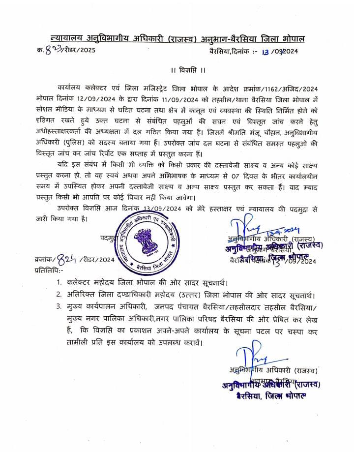 कलेक्टर कौशलेंद्र विक्रम सिंह ने बैरसिया घटना की मजिस्ट्रेट जांच के आदेश दिए है। एसडीएम बैरसिया की अध्यक्षता में टीम गठित की गई है। टीम में एसडीओपी मंजु चौहान को सदस्य बनाया गया है। घटना की जांच कर एक सप्ताह में रिपोर्ट सौंपने के आदेश दिए है। अन्य किसी के पास भी घटना से जुड़े साक्ष्य या दस्तावेज हो तो एक सप्ताह के अंदर एसडीएम कार्यालय में देने कहा गया है। मामले में मुस्लिम समुदाय के लड़के पर छेड़छाड़ और सोशल मीडिया पर वीडियो वायरल करने के आरोप लगे थे।