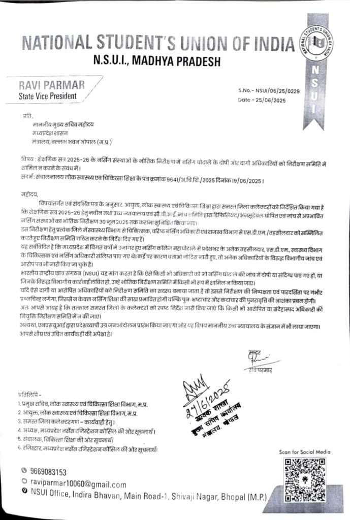 आरोप है कि पैसे न देने वाले कॉलेजों को “अनफिट” घोषित कर मान्यता से वंचित किया जा रहा है. जबकि जो कॉलेज मोटी रकम दे रहे हैं, उन्हें “सूटीबल” रिपोर्ट दी जा रही है. एक ही बिल्डिंग में कई कॉलेज संचालित हो रहे हैं. जिनकी मापदंडों पर बिना जांच के अनुमोदन किया जा रहा है. एनएसयूआई का यह भी आरोप लगाया कि एक संगठित सिंडिकेट प्रदेश में नर्सिंग शिक्षा को व्यापार बनाकर छात्रों के भविष्य से खिलवाड़ कर रहा है.