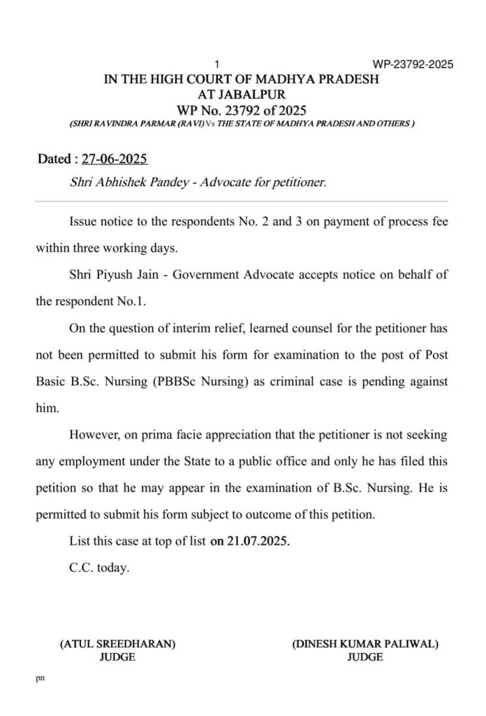 राकेश चतुर्वेदी, भोपाल। नर्सिंग घोटाले को उजागर करने वाले एनएसयूआई प्रदेश उपाध्यक्ष रवि परमार को हाईकोर्ट से बड़ी राहत मिली है। रवि परमार को एमएससी नर्सिंग परीक्षा 2025 में बैठने की अनुमति मिल गई है। परमार के अधिवक्ता अभिषेक पाण्डेय और नवीन वासवानी द्वारा दायर याचिका पर सुनवाई के बाद हाईकोर्ट ने यह फैसला सुनाया। रवि परमार ने पारदर्शिता से आवेदन फार्म भरा था। MPESB ने FIR के आधार पर फार्म निरस्त कर दिया था।