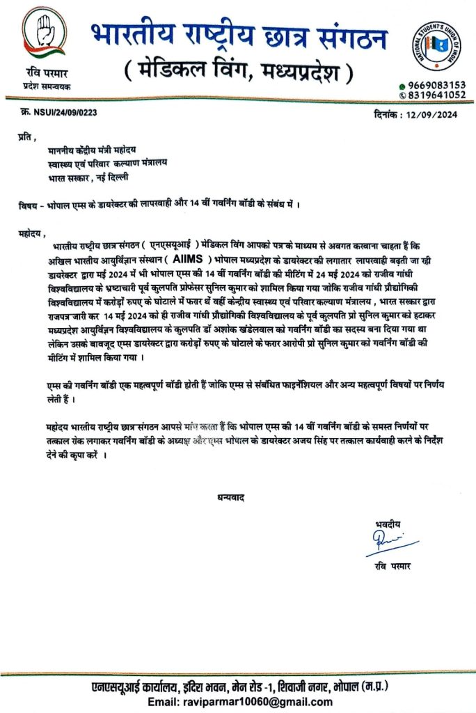 सुधीर दंडोतिया, भोपाल। मध्य प्रदेश के एक मात्र एम्स भोपाल में लगातार गड़बड़ी बढ़ती जा रही है, जिसे लेकर गुरुवार को एनएसयूआई नेता रवि परमार ने केन्द्रीय स्वास्थ्य एवं परिवार कल्याण मंत्री जेपी नड्डा को पत्र लिखा है। परमार ने शिकायत पत्र में लिखा कि अखिल भारतीय आयुर्विज्ञान संस्थान ( एम्स ) भोपाल के डायरेक्टर की लगातार लापरवाही बढ़ती जा रही है। डायरेक्टर द्वारा मई 2024 में भी भोपाल एम्स की 14 वीं गवर्निंग बॉडी की मीटिंग में 24 मई 2024 को राजीव गांधी विश्वविद्यालय के पूर्व कुलपति प्रोफेसर सुनील कुमार को शामिल किया गया, जोकि राजीव गांधी प्रौद्योगिकी विश्वविद्यालय में करोड़ों रुपए के घोटाले में फरार थे।
