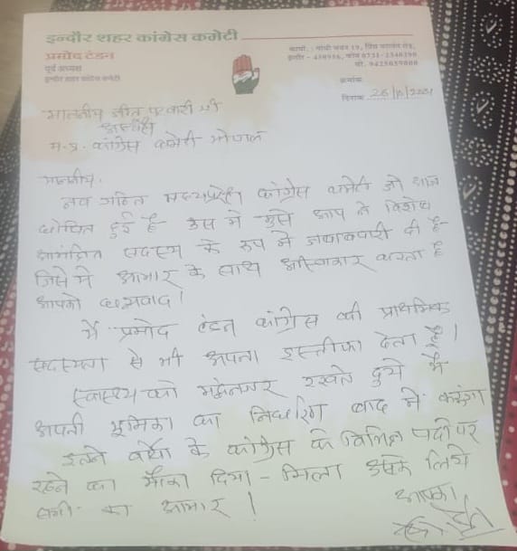 शब्बीर अहमद, भोपाल। मध्यप्रदेश कांग्रेस कमेटी की कार्यकारिणी का ऐलान होते ही नेताओं के बीच शिकवा शिकायत भी सामने आने लगी है। धड़ों में बंटे कांग्रेस में प्रदेश कार्यकारिणी गठन के बाद इस्तीफे का दौर भी शुरू हो गया है। इसी कड़ी में इंदौर पूर्व शहर अध्यक्ष प्रमोद टंडन ने कांग्रेस पार्टी छोड़ दी है। एक तरफ मिला पद, दूसरी तरफ पार्टी से इस्तीफा दे दिया है। नई कार्यकारिणी में विशेष आमंत्रित सदस्य बनाए गए प्रमोद टंडन ने कांग्रेस छोड़ दी है। इस्तीफे का कारण अपने स्वास्थ्य को बताया है।
