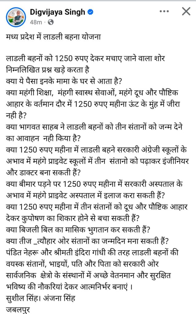 शब्बीर अहमद, भोपाल। मध्यप्रदेश के पूर्व मुख्यमंत्री एवं कांग्रेस नेता दिग्विजय सिंह ने लाडली बहना योजना के बहाने बीजेपी और संघ पर सियासी हमला बोला है। दिग्विजय सिंह ने लाडली बहनों को मिलने वाले पैसे पर सवाल उठाए हैं। उन्होंने यह सवाल सोशल मीडिया पर उठाया है।