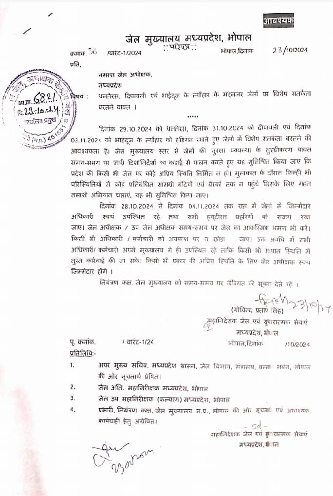 महानिदेशक जेल एवं सुधारात्मक सेवाएं भोपाल गोविंद प्रताप सिंह के हस्ताक्षर से जारी आदेश में कहा गया है कि 28 अक्टूबर से 4 नवंबर तक जेल में अधिकारी औचक निरीक्षण करेंगे। कैदी के परिजन जो सामान भेजें उसकी जांच अच्छे से करें।लापरवाही या अप्रिय स्थिति के लिए जेल अधीक्षक जिम्मेदार होंगे। आदेश की प्रतियां संबंधित विभाग के अधिकारियों को भेज दी गई है।