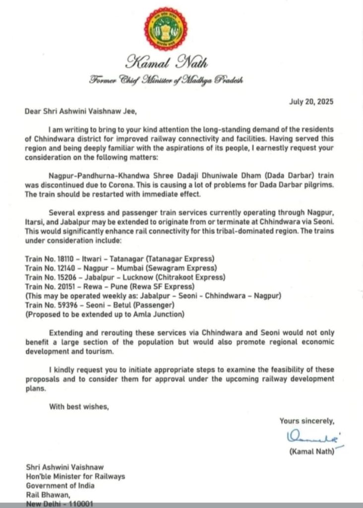 कमलनाथ ने पत्र में यह भी उल्लेख किया कि पांढुर्णा जिले से प्रतिदिन नागपुर आने-जाने वाले छात्र, व्यापारी और नौकरीपेशा लोग पहले जिन ट्रेनों से अपडाउन करते थे, वे सभी ट्रेनें अब पांढुर्णा में नहीं रुकतीं। उन्होंने मांग की कि पूर्व में पांढुर्णा रेलवे स्टेशन पर जिन ट्रेनों का स्टॉपेज था, उन्हें पुनः शुरू किया जाए। नाथ कहा कि इन सेवाओं का विस्तार न सिर्फ स्थानीय आबादी को लाभ पहुंचाएगा, बल्कि पर्यटन और क्षेत्रीय विकास को भी गति देगा।