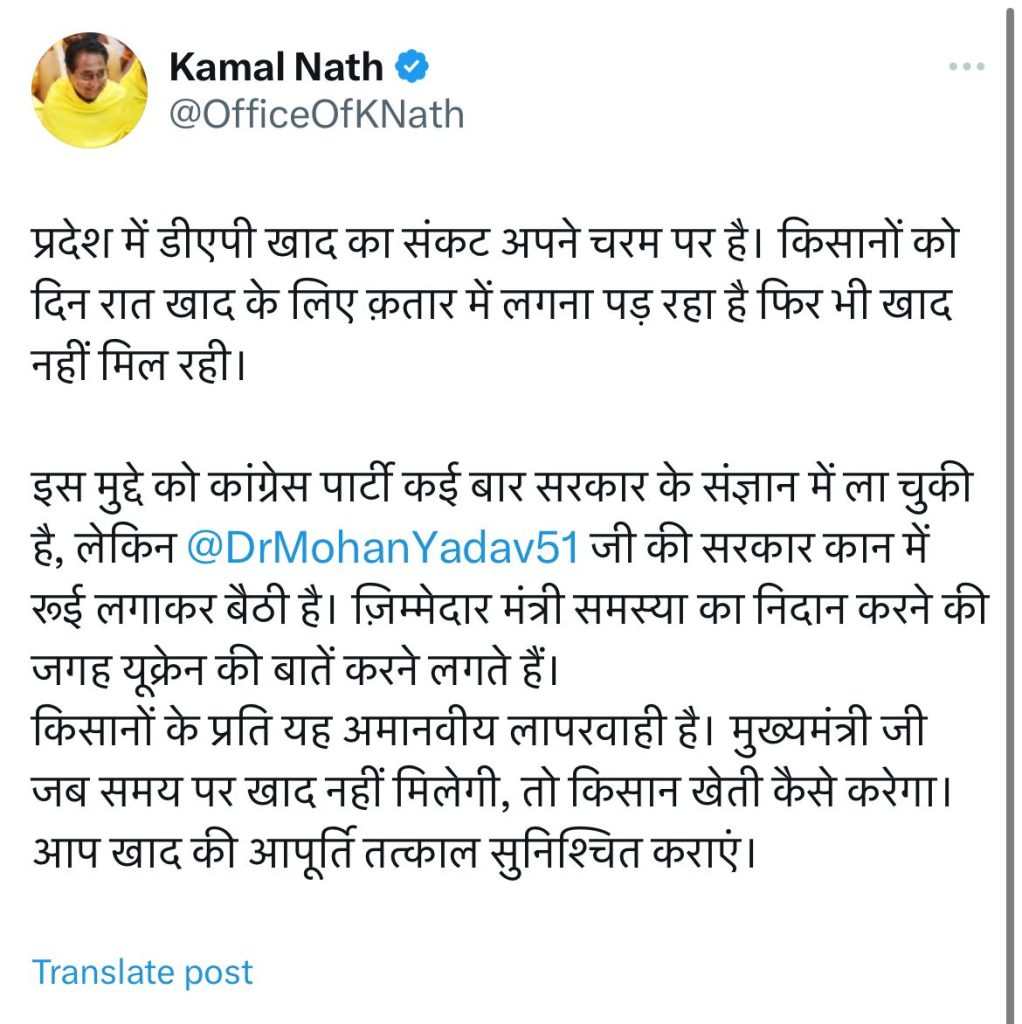 पूर्व सीएम कमलनाथ का ट्वीट- प्रदेश में डीएपी खाद का संकट अपने चरम पर है। किसानों को दिन रात खाद के लिए कतार में लगना पड़ रहा है फिर भी खाद नहीं मिल रही। इस मुद्दे को कांग्रेस पार्टी कई बार सरकार के संज्ञान में ला चुकी है, लेकिन @DrMohanYadav51 जी की सरकार कान में रूई लगाकर बैठी है। जिम्मेदार मंत्री समस्या का निदान करने की जगह यूक्रेन की बातें करने लगते हैं। किसानों के प्रति यह अमानवीय लापरवाही है। मुख्यमंत्री जी जब समय पर खाद नहीं मिलेगी, तो किसान खेती कैसे करेगा। आप खाद की आपूर्ति तत्काल सुनिश्चित कराएं।