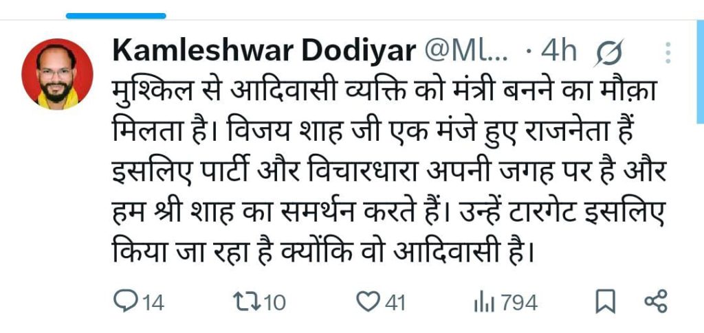 मंत्री विजय शाह के समर्थन में रतलाम के सैलाना विधायक कमलेश्वर डोडियार खुलकर आ गए हैं। विधायक ने ‘X’ पर लिखा- मुश्किल से आदिवासी व्यक्ति को मंत्री बनने का मौका मिलता है। विजयशाह जी एक मंझे हुए राजनेता है, इसलिए पार्टी और विचारधारा अपनी जगह पर है। हम शाह का समर्थन करते है। उन्हें टारगेट इसलिए किया जा रहा है क्योकि वह आदिवासी है।