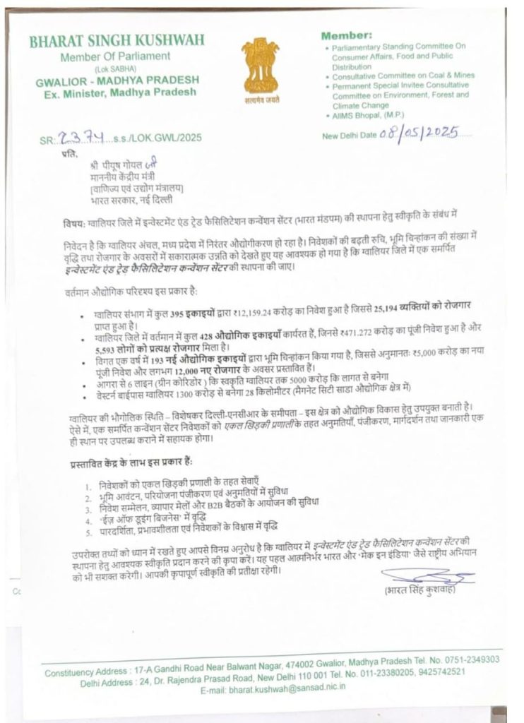 कर्ण मिश्रा, ग्वालियर। मध्य प्रदेश के ग्वालियर में दिल्ली की तरह इन्वेस्टमेंट एंड ट्रेड फैसिलिटेशन कन्वेंशन सेंटर यानी भारत मंडपम की स्थापना के लिए प्रस्ताव दिया गया है। सांसद भारत सिंह कुशवाह ने केंद्रीय वाणिज्य एवं उद्योग मंत्री पीयूष गोयल से मुलाकात कर यह अनुरोध पत्र दिया है। इसके बाद व्यापारी वर्ग में चर्चा है कि इसे ग्वालियर व्यापार मेले में स्थापित करने की तैयारी है।