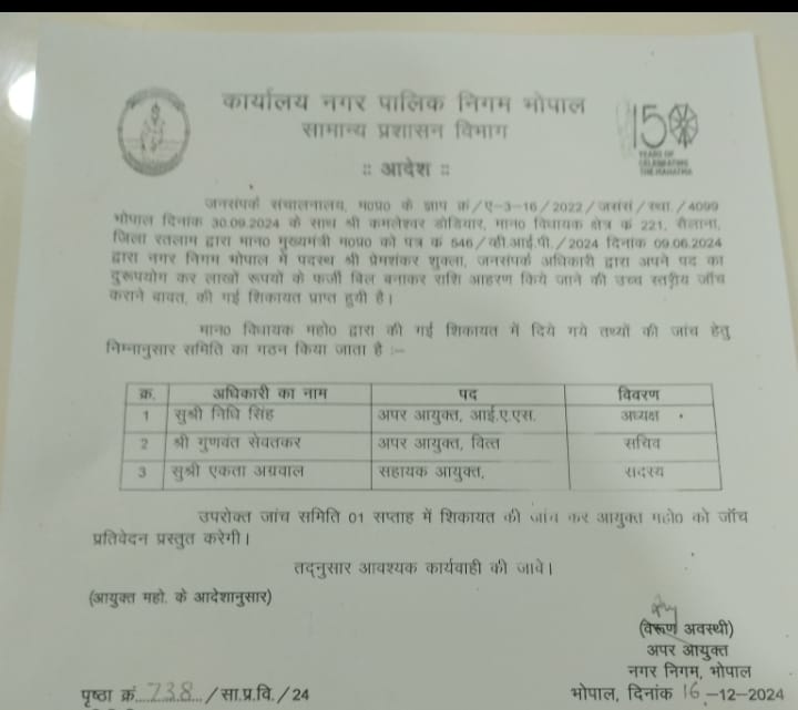 शब्बीर अहमद, भोपाल। नगर निगम के जनसंपर्क अधिकारी प्रेमशंकर शुक्ला पर गबन के गंभीर आरोप लगे हैं। 3 सदस्यीय टीम घोटाले की जांच करेगी। नगर निगम ने जांच कमेटी का जिम्मा अपर आयुक्त निधि सिंह को दिया है। कमेटी में अपर आयुक्त वित्त गुणवंत सेवतकर और सहायक आयुक्त एकता अग्रवाल भी शामिल है।