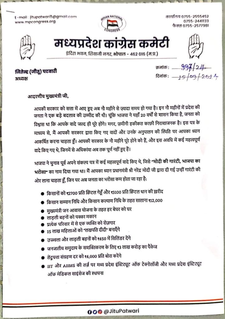 शब्बीर अहमद, भोपाल। मध्यप्रदेश कांग्रेस कमेटी के अध्यक्ष जीतू पटवारी ने मुख्यमंत्री डॉ मोहन यादव को पत्र लिखकर 9 महीने के कार्यकाल को लेकर सवाल पूछे है। चुनाव में मोदी की गारंटी भाजपा का भरोसा का नाम दिया लेकिन आज तक वादे पूरे नहीं हुए। मुझे उम्मीद है कि आप जनता से किये वादे जल्द पूरा करेंगे।