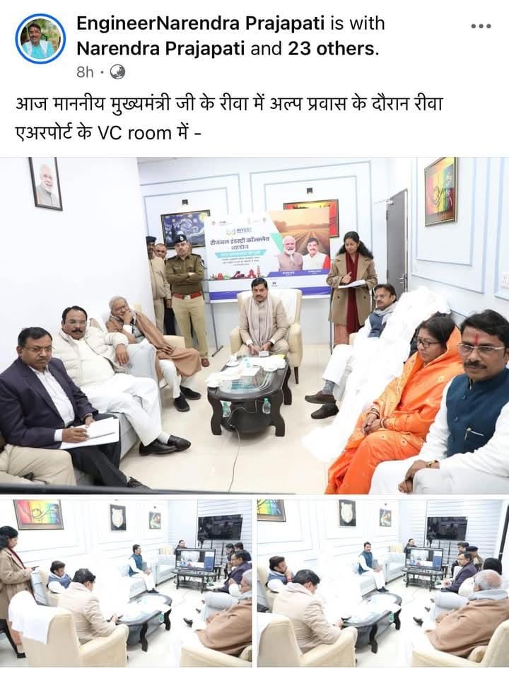 बता दें कि सोमवार की रात सीएम डॉ. मोहन यादव अल्प प्रवास पर रीवा पहुंचे थे. एयरपोर्ट पर ही उन्होंने शहड़ोल रीजनल इंडस्ट्री कॉन्क्लेव कार्यक्रम को लेकर उद्योगपतियों से वीडियो कॉन्फ्रेंसिंग के जरिए चर्चा की. जहां डिप्टी सीएम राजेन्द्र शुक्ल, सांसद जनार्दन मिश्रा, त्योंथर विधायक सिद्धार्थ तिवारी, मनगवां विधायक नरेंद्र प्रजापति सहित अन्य नेता और प्रशासनिक अधिकारी भी मौजूद थे. मंगलवार को विधायक नरेंद्र प्रजापति ने अपने सोशल मीडिया अकाउंट फेसबुक में एक पोस्ट शेयर की, जिसमें विधायक सिद्दार्थ तिवारी गायब थे.
