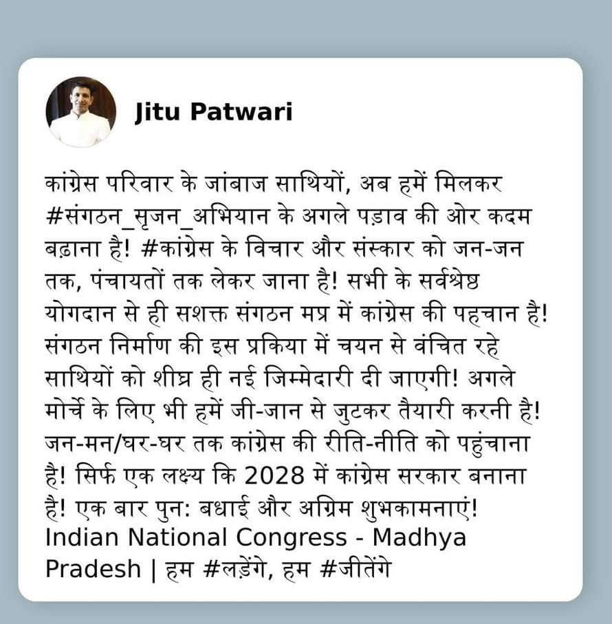 कांग्रेस के डैमेज कांग्रेस में जुटे पीसीसी चीफ जीतू पटवारी ने सोशल मीडिया पर लिखा- कांग्रेस परिवार के जांबाज साथियों, अब हमें मिलकर संगठन सृजन अभियान के अगले पड़ाव की ओर कदम बढ़ाना है! कांग्रेस के विचार और संस्कार को जन-जन तक, पंचायतों तक लेकर जाना है! सभी के सर्वश्रेष्ठ योगदान से ही सशक्त संगठन मप्र में कांग्रेस की पहचान है! संगठन निर्माण की इस प्रकिया में चयन से वंचित रहे साथियों को शीघ्र ही नई जिम्मेदारी दी जाएगी! अगले मोर्चे के लिए भी हमें जी-जान से जुटकर तैयारी करनी है! जन-मन/घर-घर तक कांग्रेस की रीति-नीति को पहुंचाना है! सिर्फ एक लक्ष्य कि 2028 में कांग्रेस सरकार बनाना है! एक बार पुनः बधाई और अग्रिम शुभकामनाएं!