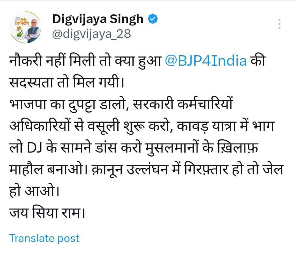 दिग्विजय सिंह ने सोशल मीडिया प्लेटफॉर्म एक्स पर लिखा, “नौकरी नहीं मिली तो क्या हुआ ⁦भाजपा⁩ की सदस्यता तो मिल गयी। भाजपा का दुपट्टा डालो, सरकारी कर्मचारियों अधिकारियों से वसूली शुरू करो, कावड़ यात्रा में भाग लो DJ के सामने डांस करो मुसलमानों के ख़िलाफ़ माहौल बनाओ। कानून उल्लंघन में गिरफ्तार हो तो जेल हो आओ। जय सिया राम।”