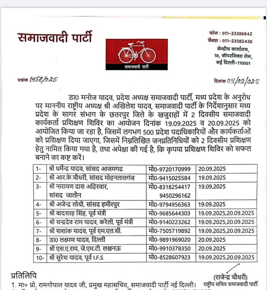 प्रेसवार्ता में मध्यप्रदेश अध्यक्ष डॉ. मनोज यादव ने खजुराहो में होने वाले समाजवादी पार्टी के दो दिवसीय प्रशिक्षण शिविर की भी जानकारी दी। इसमें सांसद, पूर्व मंत्री, जिलाध्यक्ष और वरिष्ठ नेता शामिल होंगे। शिविर में 2027 नगरीय निकाय चुनाव और 2028 विधानसभा चुनाव की रणनीति तय की जाएगी।