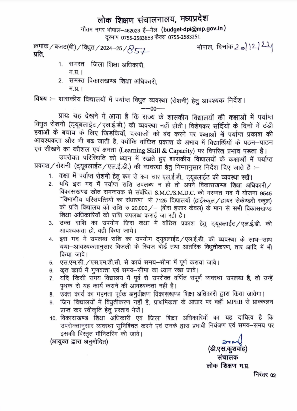विभाग ने हर विकासखंड को 20 हजार रुपए देकर बिजली की व्यवस्था करने के लिए निर्देश हैं. साथ ही कहा कि कक्षा में पर्याप्त रोशनी के लिए कम से कम से कम चार एलईडी या ट्यूबलाइट की व्यवस्था रखें.