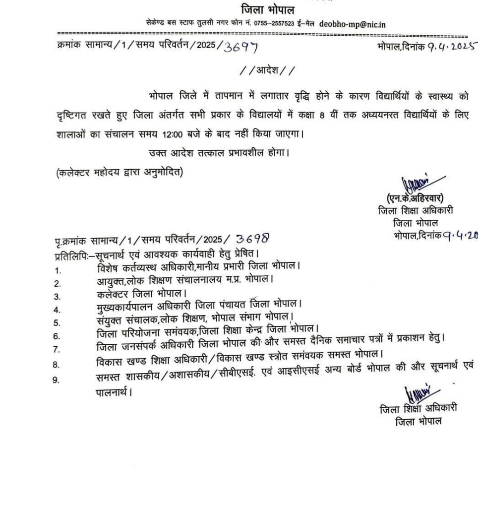 जारी आदेश के अनुसार अब 12 बजे के बाद आठवीं तक के विद्यार्थियों की कक्षाएं 12 बजे के बाद नहीं लगेंगी। यह फैसला छात्रों को भीषण गर्मी में सहूलियत और उनके स्वास्थ्य खराब न हो, इसे ध्यान में रखकर लिया गया है। वर्तमान समय में भोपाल सहित कई जिलों में सुबह से ही अत्यधिक गर्मी का अनुभव हो रहा है, जिससे विद्यार्थियों की शारीरिक व मानसिक स्थिति पर नकारात्मक प्रभाव पड़ सकता है।