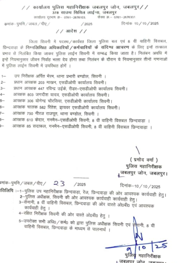 शिकायत के बाद त्वरित कार्रवाई करते हुए जबलपुर रेंज के पुलिस महानिरीक्षक (IG) प्रमोद वर्मा ने मामले का संज्ञान लिया। जांच के बाद तत्काल प्रभाव से बंडोल थाना प्रभारी अर्पित भैरम, बंडोल पुलिस स्टेशन और CSP कार्यालय के स्टाफ समेत कुल 9 पुलिसकर्मियों को निलंबित कर दिया गया। सूत्रों के अनुसार, CSP पूजा पांडे के खिलाफ भी विभागीय कार्रवाई का प्रस्ताव तैयार किया जा रहा है।