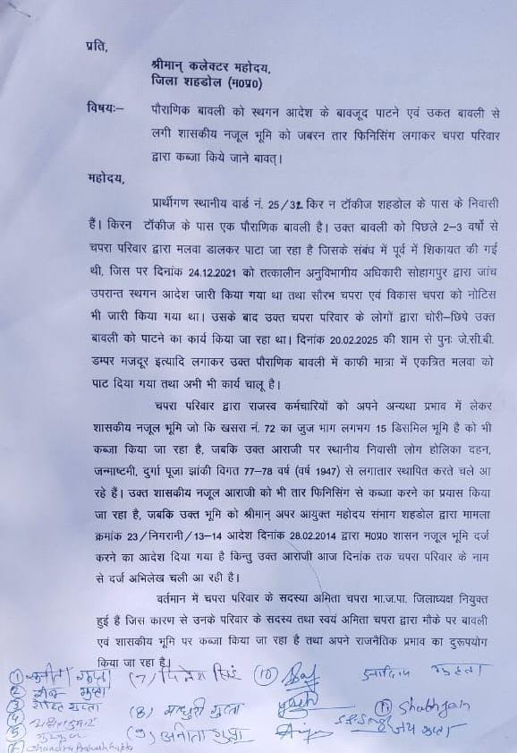 अजयारविंद नामदेव, शहडोल। मध्य प्रदेश के शहडोल में भाजपा जिला अध्यक्ष के खिलाफ स्थानीय लोगों ने मोर्चा खोल दिया है, यहां वार्ड क्रमांक 32 के लोगों ने बीजेपी की नवनियुक्त जिला अध्यक्ष अमिता चपरा पर सार्वजनिक जमीन और बावली पर अवैध कब्जा करने का गंभीर आरोप लगाया है। इसका विरोध कर रहे स्थानीय लोगों ने कलेक्ट्रेट परिसर में जिला अध्यक्ष मुर्दाबाद के नारे लगाए।