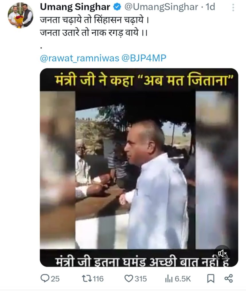 वीडियो 6 वर्ष पुराना है, इसका प्रमाण यह है कि वीडियो में रावत के तत्कालीन पीएसओ बृजकिशोर सिंह चौहान दिखाई दे रहे हैं. जो वर्ष 2009 से 2018 तक रामनिवास रावत की निज सुरक्षा में तैनात थे. इसके बाद वे रावत की सुरक्षा से हट गए थे. इससे स्वयं सिद्ध होता है कि विजयपुर विधानसभा उपचुनाव में कांग्रेस पुराने वीडियो के जरिए भाजपा प्रत्याशी रामनिवास रावत की छवि धूमिल कर चुनाव को प्रभावित करने का कार्य कर रही है.