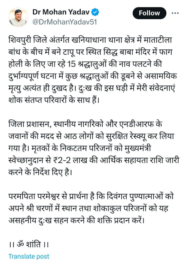 सीएम डॉ. मोहन ने अपने सोशल मीडिया अकाउंट एक्स पर लिखा- शिवपुरी जिले अंतर्गत खनियाधाना थाना क्षेत्र में माताटीला बांध के बीच में बने टापू पर स्थित सिद्ध बाबा मंदिर में फाग होली के लिए जा रहे 15 श्रद्धालुओं की नाव पलटने की दुर्भाग्यपूर्ण घटना में कुछ श्रद्धालुओं की डूबने से असामयिक मृत्यु अत्यंत ही दुखद है. दुख की इस घड़ी में मेरी संवेदनाएं शोक संतप्त परिवारों के साथ हैं.