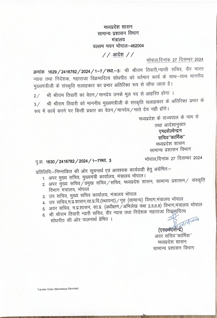 शब्बीर अहमद, भोपाल। MP News: पूर्व संस्कृति संचालक श्रीराम तिवारी (Shri Ram Tiwari) को मुख्यमंत्री डॉ. मोहन यादव (CM Dr. Mohan Yadav) का संस्कृति संचालक (Cultural Advisor) बनाया गया है। सामान्य प्रशासन विभाग (GAD) ने इसे लेकर आदेश जारी कर दिया है।