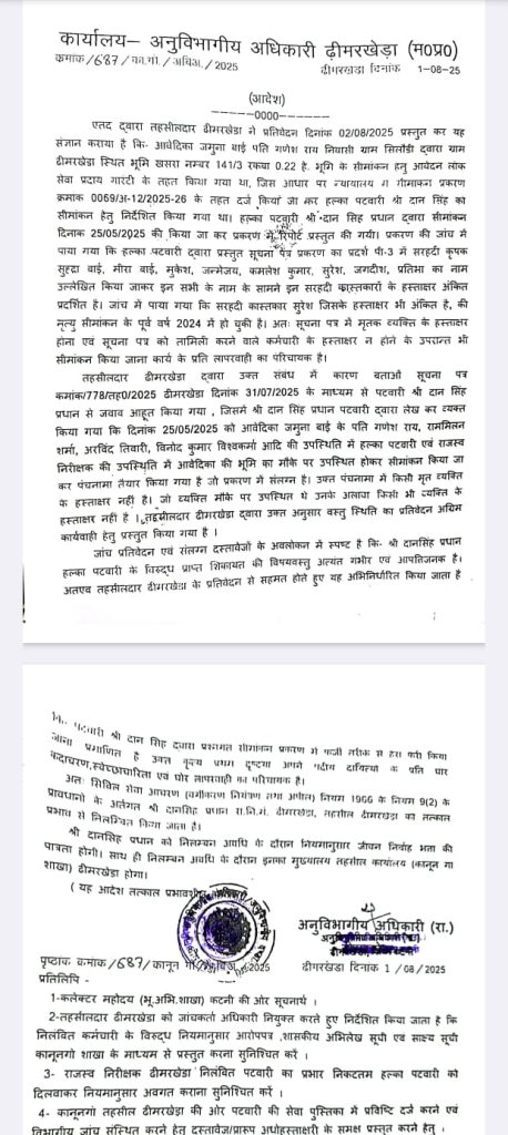 सीमांकन कार्य में मृत व्यक्तियों के हस्ताक्षर करने के मामले में तहसीलदार नितिन पटेल ने पटवारी को कारण बताओ नोटिस दिया था। संतोषजनक जवाब नहीं मिलने पर एसडीएम को कार्रवाई के लिए प्रतिवेदन भेजा गया। एसडीएम निधि गोहल ने पटवारी दान सिंह के खिलाफ निलंबन की कार्रवाई की है। इस संबंध में एसडीएम ने बताया कि सीमांकन कार्य में मृत व्यक्तियों के हस्ताक्षर करने की शिकायत प्राप्त हुई और जांच में आरोप सही पाए गए। निलंबन की अवधि में पटवारी तहसील मुख्यालय कानून गो शाखा में रहेंगे।