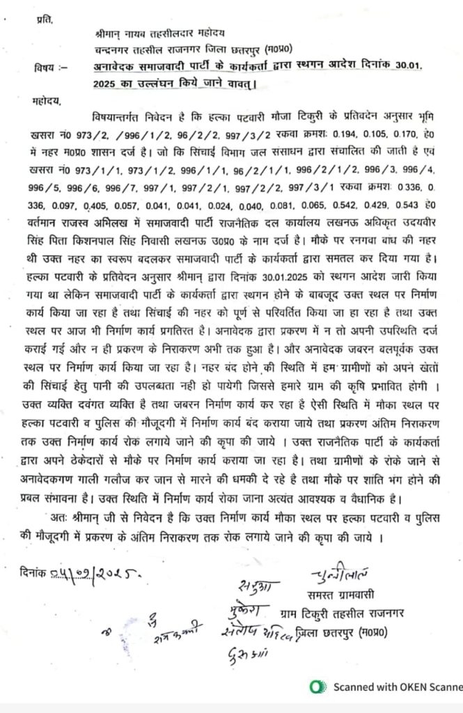 राजस्व अभिलेख और हल्का पटवारी की रिपोर्ट के अनुसार विवादित खसरा नंबर 973/2, 996/1/2, 95/2/2, 997/3/2 में सिंचाई विभाग की नहर दर्ज है। आरोप है कि समाजवादी पार्टी के कार्यकर्ताओं ने नहर का स्वरूप बदलकर भूमि को समतल कर निर्माण शुरू कर दिया। जबकि आदेश में लिखा गया है कि स्थगन आदेश के बाद निर्माण जारी है और सिंचाई की नहर के स्वरुप को परिवर्तित किया जा रहा है। अनावेदक ने न तो प्रकरण में अपनी उपस्थिति दर्ज कराई और न ही अब तक निराकरण हुआ है।