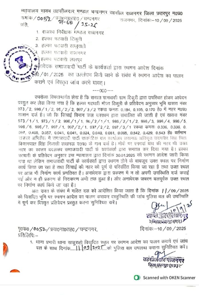 शशांक द्विवेदी, खजुराहो। बमीठा मार्ग और एयरपोर्ट की बाउंड्री के पास टिकुरी मौजा में बन रहे समाजवादी पार्टी के प्रदेश कार्यालय का निर्माण एक बार फिर सुर्खियों में आ गया है। राजनगर नायब तहसीलदार ने 30 जनवरी 2025 को जारी स्थगन आदेश का पालन न होने पर टीम गठित कर 11 सितंबर 2025 को पुलिस बल की मौजूदगी में मौके का निरीक्षण कराने के आदेश जारी किए हैं।