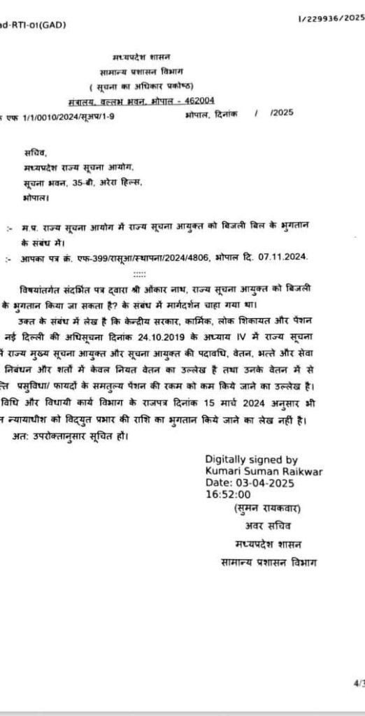 शब्बीर अहमद, भोपाल। मध्यप्रदेश राज्य सूचना आयुक्त ने मुक्त बिजली मांगी है। सूचना आयुक्त के पत्र के जवाब में सामान्य प्रशासन विभाग ने जवाब दिया कि ऐसा कोई प्रावधान नहीं है।