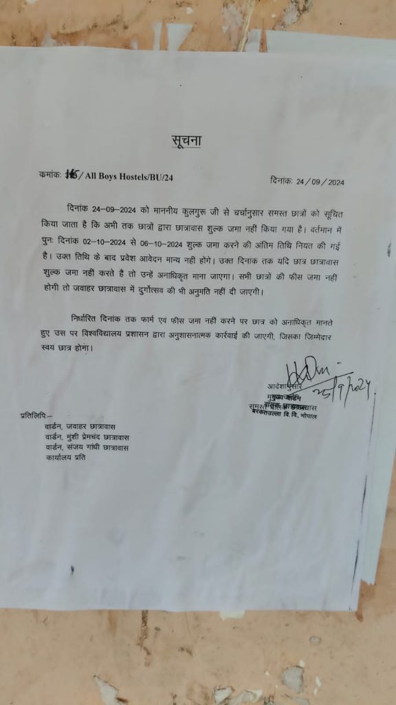 शिखिल ब्यौहार, भोपाल। मध्यप्रदेश के बरकतउल्ला विश्वविद्यालय प्रबंधन का एक और अजीब नोटिस सामने आया है। विश्वविद्यालय के हॉस्टल के छात्रों के लिए नोटिस जारी किया गया है। नोटिस में कहा गय़ा है कि फीस जमा नहीं करने पर दुर्गा उत्सव नहीं मनाने दिया जाएगा। इस आदेश पर नया विवाद खड़ा हो गया है। समय पर फीस नहीं भरे जाने पर दुर्गा उत्सव मनाने की परमिशन नहीं मिलेगी। हाल ही में विश्वविद्यालय में भगत सिंह की जयंती नहीं मानने देने पर भी विवाद की स्थिति निर्मित हुई थी। वहीं संस्कृति बचाओ मंच ने नोटिस को तुगलगी फरमान बताया है।