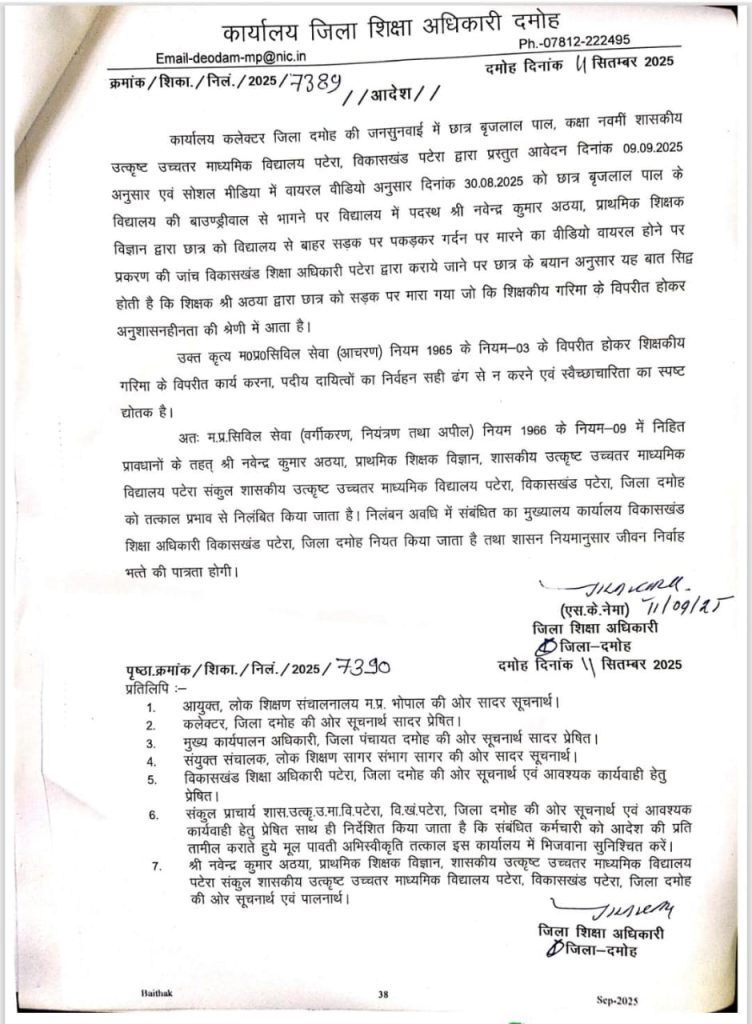 बीडी शर्मा, दमोह। मध्य प्रदेश के दमोह में छात्र को बीच सड़क पर मारपीट करने वाले शिक्षक को निलंबित कर दिया गया है। यहां उत्कृष्ट विद्यालय पटेरा में पदस्थ शिक्षक नवेंद्र कुमार अठया पर जिला शिक्षा अधिकारी एस के नेमा ने तत्काल कार्रवाई की है। शिक्षक नवेंद्र कुमार अठया पर एक छात्र बृजलाल पाल के साथ बीच सड़क पर मारपीट करने का गंभीर आरोप लगा है। इस घटना का वीडियो सोशल मीडिया पर वायरल हो गया था, जिसके बाद छात्र की शिकायत पर जिला शिक्षा अधिकारी एस के नेमा ने सख्त रुख अपनाते हुए शिक्षक को तत्काल प्रभाव से निलंबित कर दिया।