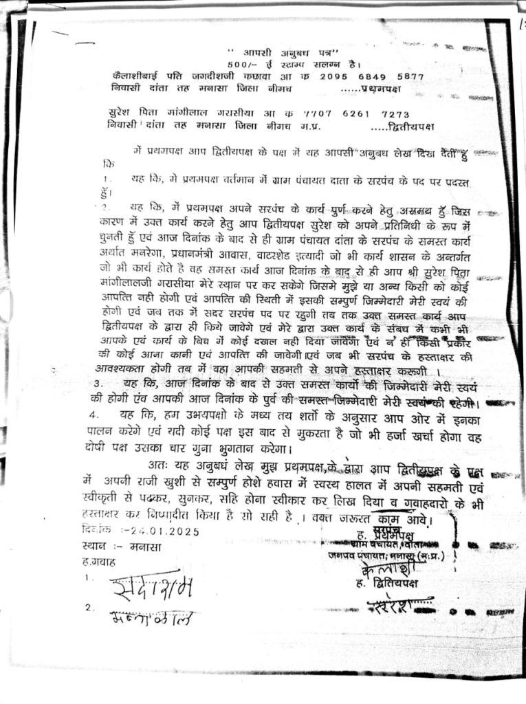 दरअसल यह पूरा घटनाक्रम नीमच जिले की मनासा तहसील के ग्राम पंचायत दाता का है। जहां की महिला सरपंच कैलाशी बाई के द्वारा सुरेश नामक व्यक्ति से ₹500 के स्टांप पर अनुबंध किया गया। जिसमें महिला सरपंच द्वारा लिखा गया कि मैं ग्राम पंचायत दाता की सरपंच हूं। मैं अपना कार्य करने में असमर्थ हूं। इस कारण अपने सारे दायित्व और कर्तव्य गांव के ही सुरेश गरासिया को सौंपते हुए अपने प्रतिनिधि के रूप में चुनती हूं। अब पंचायत के सारे काम वे ही करेंगे। इसमें मुझे कोई आपत्ति नहीं होगी। ये जहां पर भी कहेंगे, वहां पर मैं अपने साइन करूंगी।
