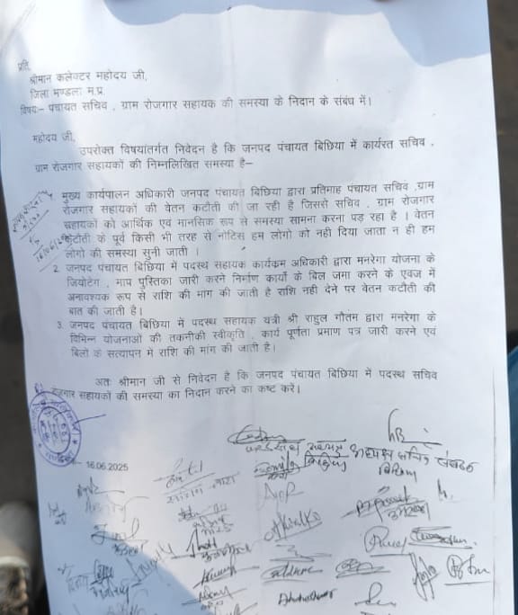 पवन राय, मंडला। जिले के बिछिया जनपद सीईओ के खिलाफ सचिव और रोजगार सहायकों ने मोर्चा खोल दिया है। सीईओ के खिलाफ कर्मचारियों ने कलेक्टर से शिकायत कर न्याय की गुहार लगाई है।