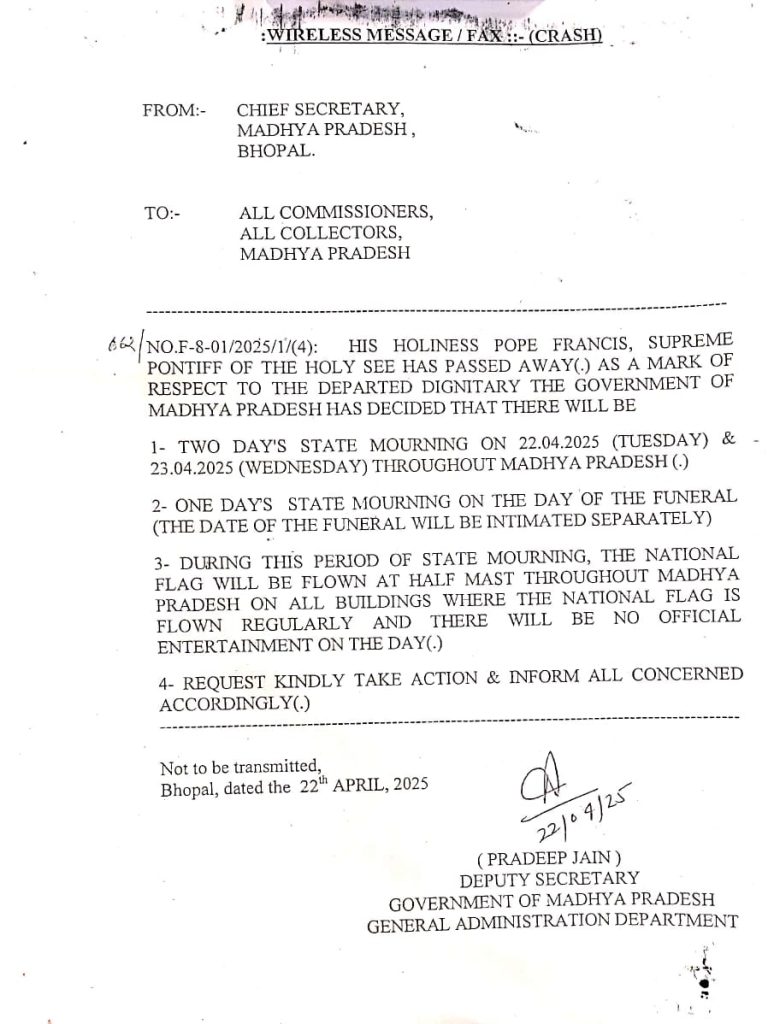 पोप फ्रांसिस के निधन पर मध्य प्रदेश में 22 और 23 अप्रैल को दो दिवसीय राजकीय शोक मनाया जाएगा। इसके अलावा अंतिम संस्कार के दिन भी राजकीय शोक रहेगा। इस दौरान पूरे मध्य प्रदेश में सभी भवनों पर राष्ट्रीय ध्वज आधा झुका रहेगा। वहीं राष्ट्रीय ध्वज नियमित रूप से फहराया जाएगा। इन दिनों कोई आधिकारिक मनोरंजन कार्यक्रम भी नहीं किए जाएंगे।