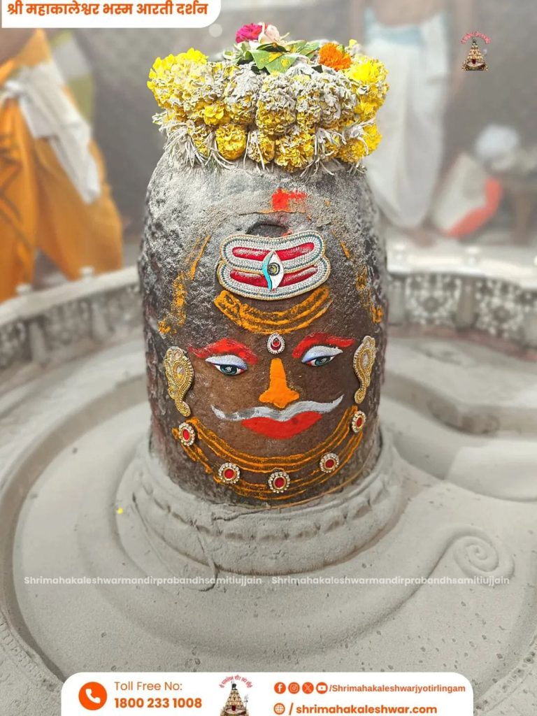 शुक्रवार को भगवान महाकाल का त्रिपुंड और त्रिनेत्र अर्पित कर दिव्य श्रृंगार किया गया। श्री महाकालेश्वर को भस्म चढ़ाई गई। साथ ही शेषनाग का रजत मुकुट, रजत की मुण्डमाल, रुद्राक्ष की माला के साथ सुगंधित पुष्प से बनी फूलों की माला धारण की। बाबा को फल और मिष्ठान का भोग लगाया गया। भोले बाबा का ड्रायफ्रूट से आकर्षक श्रृंगार किया गया।