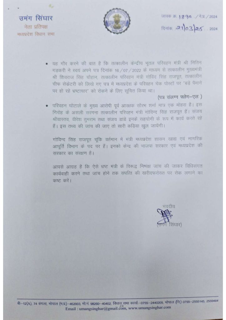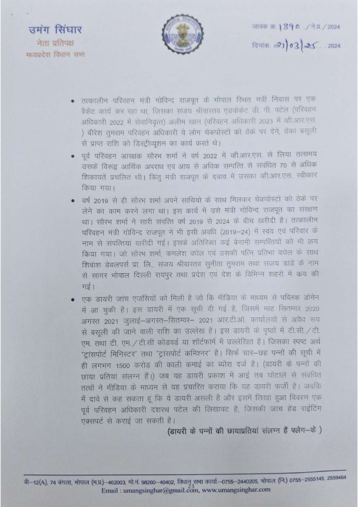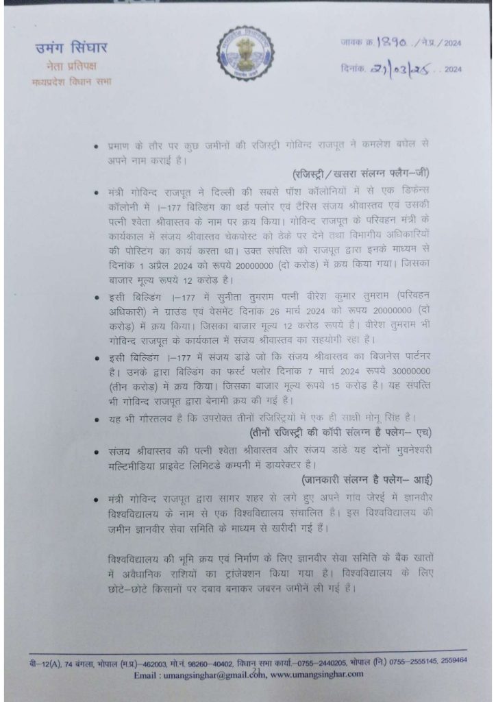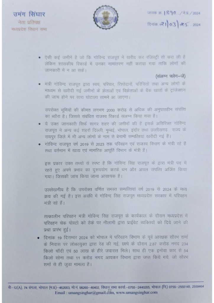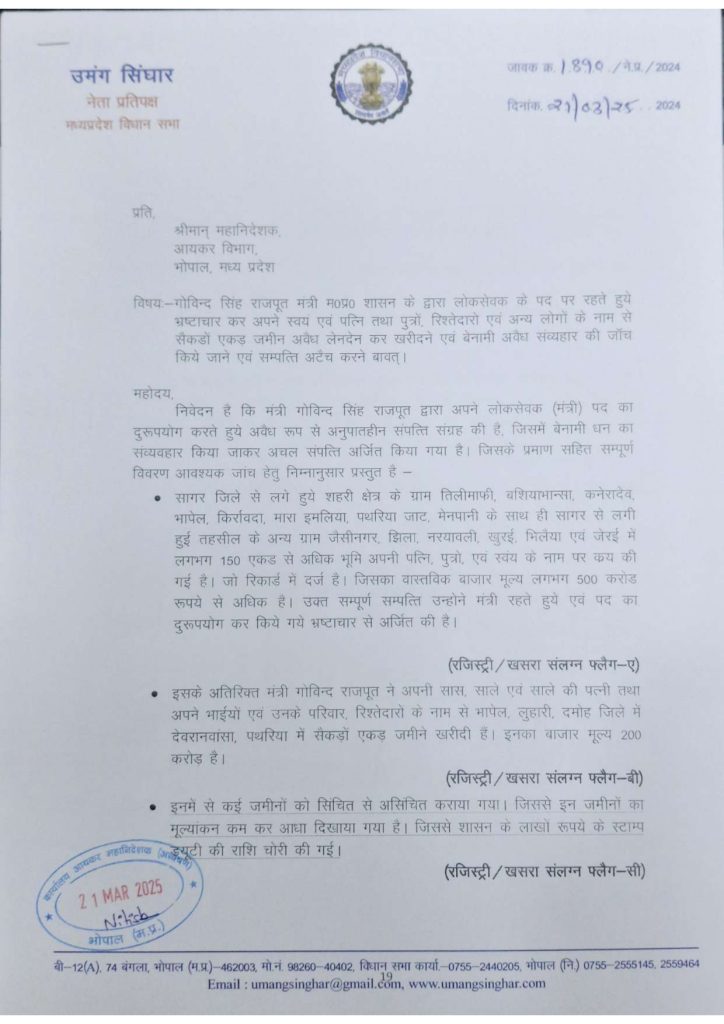 उमंग सिंघार ने दावा किया कि मंत्री गोविन्द सिंह राजपूत ने लोकसेवक के पद पर रहते हुए भ्रष्टाचार कर पत्नी, पुत्रों, रिश्तेदारो और अन्य लोगों समेत अपने नाम से सैकड़ों एकड़ जमीन अवैध लेनदेन कर खरीदी। उन्होंने आयकर विभाग से इस मामले की जांच करने और संपत्ति अटैच करने की मांग की।