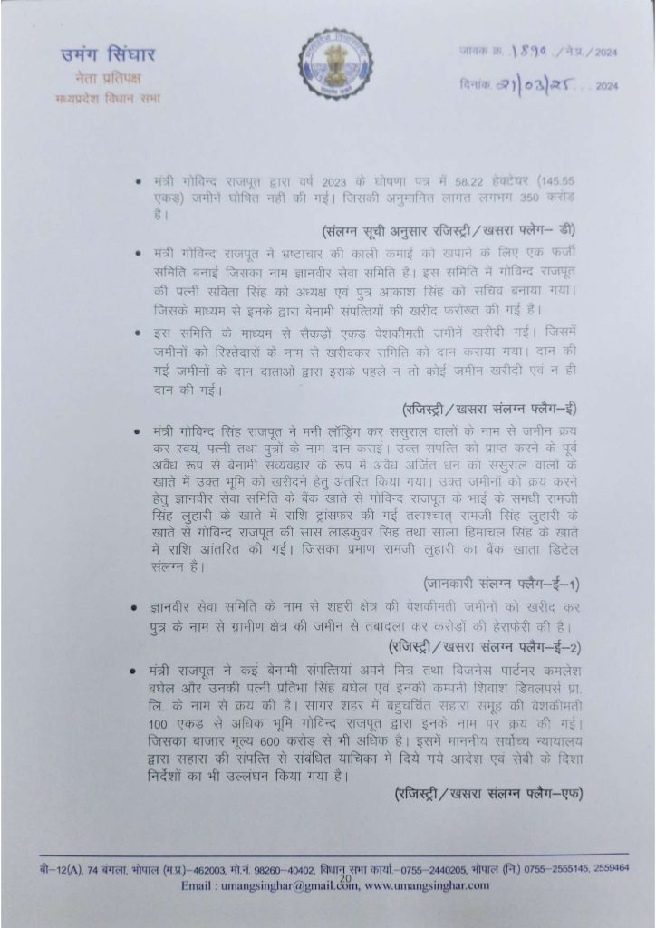 उमंग सिंघार ने आरोप लगाया कि मंत्री गोविंद राजपूत ने साल 2023 के घोषणा पत्र में 58.22 हेक्टेयर (145.55 एकड़) जमीनें घोषित नहीं की। जिसकी अनुमानित लागत लगभग 350 करोड है। मंत्री गोविंद राजपूत ने भ्रष्टाचार की काली कमाई को खपाने के लिए एक फर्जी समिति बनाई, जिसका नाम ज्ञानवीर सेवा समिति है। इस समिति में गोविंद राजपूत की पत्नी सविता सिंह को अध्यक्ष और पुत्र आकाश सिंह को सचिव बनाया गया। जिसके माध्यम से इनके द्वारा बेनामी संपत्तियों की खरीद फरोख्त की गई है। उमंग सिंघार ने यह भी कहा कि इस समिति के माध्यम से सैकड़ों एकड़ बेशकीमती जमीनें खरीदी गई। जिसमें जमीनों को रिश्तेदारों के नाम से खरीदकर समिति को दान कराया गया। दान की गई जमीनों के दान दाताओं ने इसके पहले न तो कोई जमीन खरीदी और न ही दान की गई।