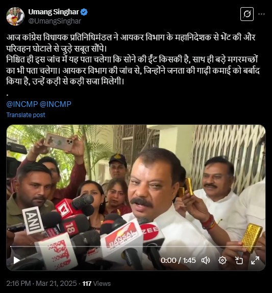 इनकम टैक्स अधिकारियों से मुलाकात के बाद नेता प्रतिपक्ष उमंग सिंघार ने कहा,”हमें निष्पक्ष जांच का आश्वासन मिला है। गोविंद राजपूत और उनके स्टाफ की रजिस्ट्री सौंपी है। दिल्ली प्रॉपर्टी की जानकारी भी दी है। सोना और पैसा किसका ये पता चलना चाहिए। ये जनता का पैसा है और कांग्रेस पार्टी किसी मंत्री, अधिकारी और पुलिस आरक्षक को नहीं खाने देगी। सौरभ शर्मा पर कार्रवाई हुई, लेकिन बड़े मगरमच्छ पर कार्रवाई नहीं हुई है। पिछले 15 साल में से भ्रष्टाचार चल रहा था किस-किस के नाम से सब उजागर होना चाहिए। समय पर सबका नाम आएगा, सब पर्दाफाश होगा।”