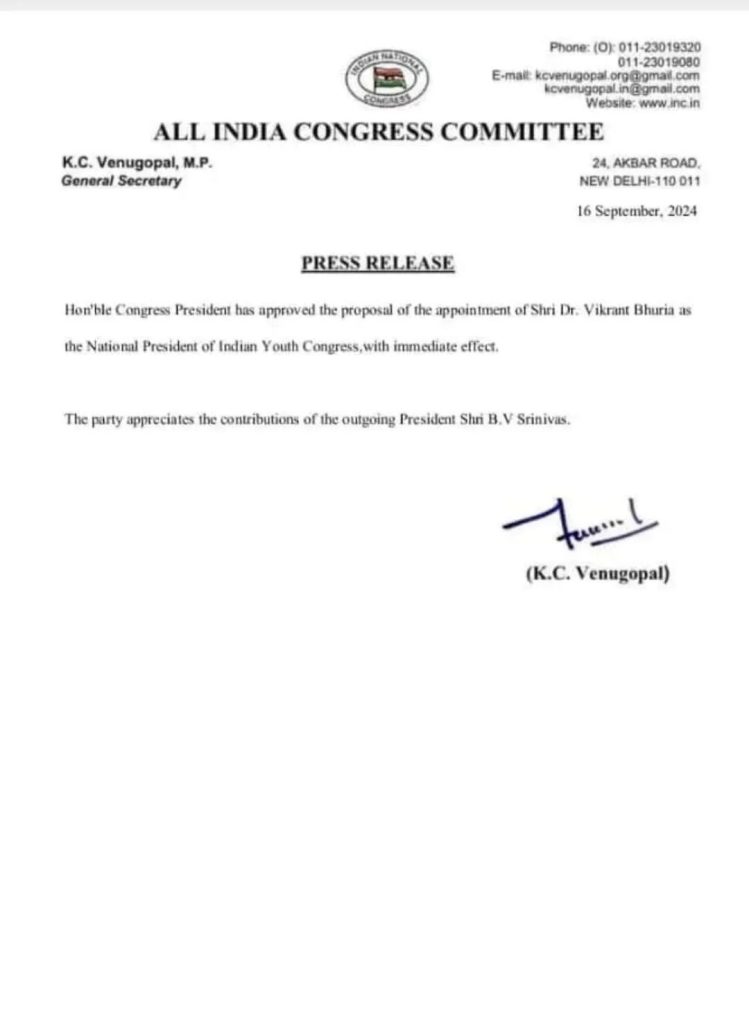 बता दें कि बीते दोनों विक्रांत भूरिया को यूथ कांग्रेस राष्ट्रीय अध्यक्ष बनाने का फर्जी पत्र वायरल हुआ था। इसमें लिखा था कि पार्टी राष्ट्रीय अध्यक्ष ने विक्रांत भूरिया को यूथ कांग्रेस का राष्ट्रीय अध्यक्ष बनाने की स्वीकृति दे दी है।