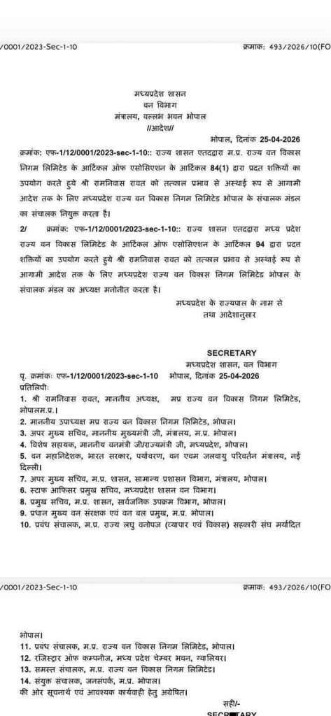मध्य प्रदेश वन विभाग ने इसे लेकर आदेश जारी किया है। इसके मुताबिक, राज्य शासन ने मध्य प्रदेश राज्य वन विकास लिमिटेड के आर्टिकल ऑफ एसोसिएशन के आर्टिकल 94 की शक्तियों का उपयोग करते हुये रामनिवास रावत को तत्काल प्रभाव से अस्थाई रूप से आगामी आदेश तक के लिए मध्यप्रदेश राज्य वन विकास निगम लिमिटेड भोपाल के संचालक मंडल का अध्यक्ष मनोनीत किया है।