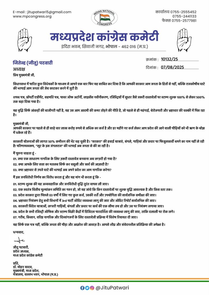 शिखिल ब्यौहार, भोपाल। मध्य प्रदेश कांग्रेस के प्रदेश अध्यक्ष जीतू पटवारी ने मुख्यमंत्री को पत्र लिखा है। उन्होंने स्टाम्प ड्यूटी में बढ़ोतरी का विरोध किया है। पीसीसी चीफ ने कहा कि यह वृद्धि सिर्फ आंकड़ों की बाजीगरी नहीं है, यह उस आम आदमी की कमर तोड़ने की नीति है, जो पहले से ही महंगाई, बेरोजगारी और भ्रष्टाचार की चक्की में पिस रहा है।