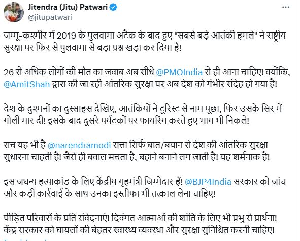 इससे पहले उन्होंने एक अन्य पोस्ट में लिखा- जम्मू-कश्मीर में 2019 के पुलवामा अटैक के बाद हुए “सबसे बड़े आतंकी हमले” ने राष्ट्रीय सुरक्षा पर फिर से पुलवामा से बड़ा प्रश्न खड़ा कर दिया है! 26 से अधिक लोगों की मौत का जवाब अब सीधे पीएमओ से ही आना चाहिए! क्योंकि, अमित शाह द्वारा की जा रही आंतरिक सुरक्षा पर अब देश को गंभीर संदेह हो गया है! देश के दुश्मनों का दुस्साहस देखिए, आतंकियों ने टूरिस्ट से नाम पूछा, फिर उसके सिर में गोली मार दी! इसके बाद दूसरे पर्यटकों पर फायरिंग करते हुए भाग भी निकले!