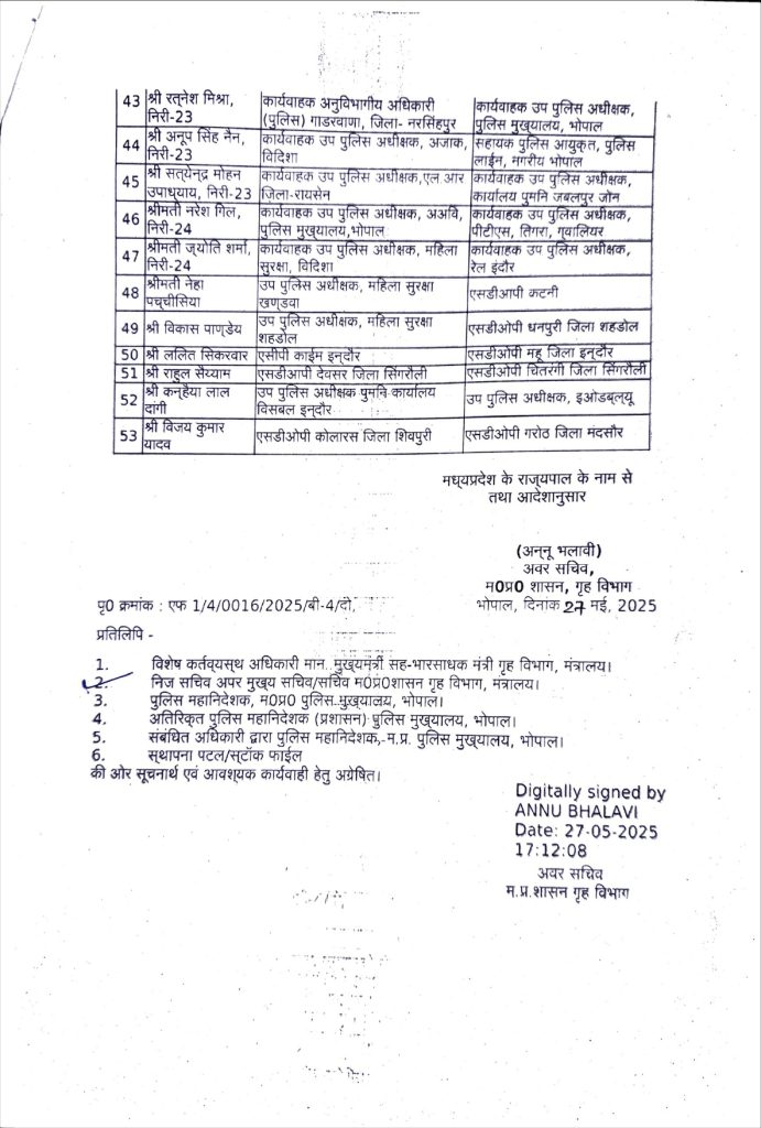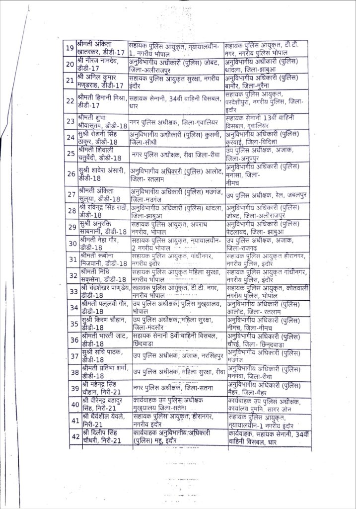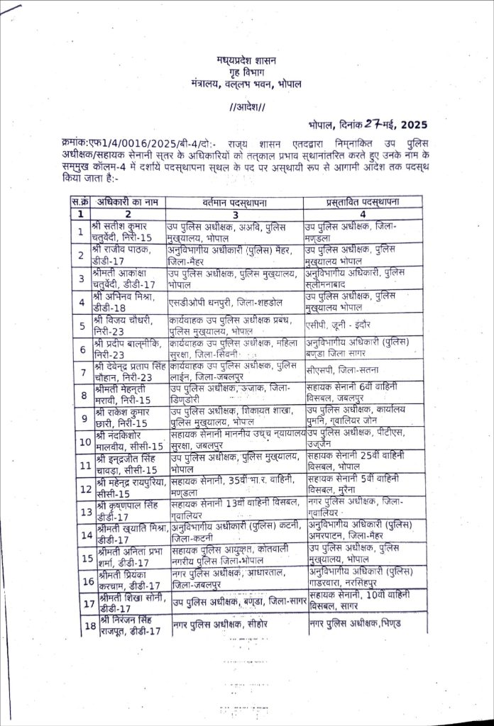 आदेश के अनुसार भोपाल समेत कई जिलों के DSP भी बदले गए हैं। वहीं, सीधी, ग्वालियर जैसी जगहों के नगर पुलिस अधीक्षक का भी ट्रांसफर हुआ है। साथ ही छिंदवाड़ा, महू में कार्यवाहक अनुविभागीय अधिकारी और सहायक सेनानी को भी इधर से उधर किया गया है। गृह विभाग के अवर सचिव अन्नू भलावी की ओर से यह आदेश जारी किया गया है।